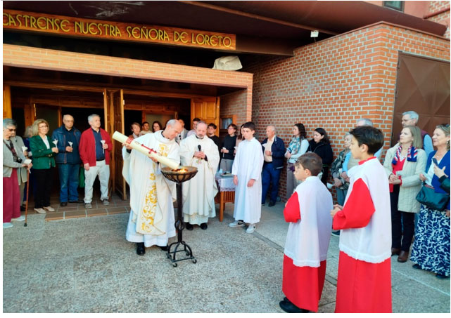 – El Sábado Santo, para conmemorar la noche santa en que el Señor resucitó, a última hora de la tarde se desarrolló la VIGILIA PASCUAL. Comenzamos con la reunión de numerosos feligreses a la entrada el Templo para la primera parte, el lucernario y el pregón pascual, con la BENDICIÓN y ENCENDIDO DEL CIRIO PASCUAL.